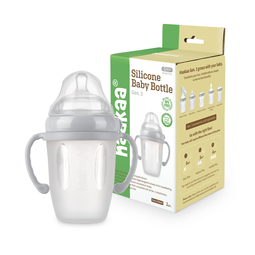 Haakaa silikonska bočica za bebe 3. generacije izvrstan je izbor za vaše dijete kad se uči samostalnosti. Izrađen je od visokokvalitetnog medicinskog silikona što ga čini iznimno mekanim i sigurnim za vaše dijete. Lako se drži u malim rukama. Osim toga, ne morate brinuti o oštećenju jer je silikon otporan na udarce.