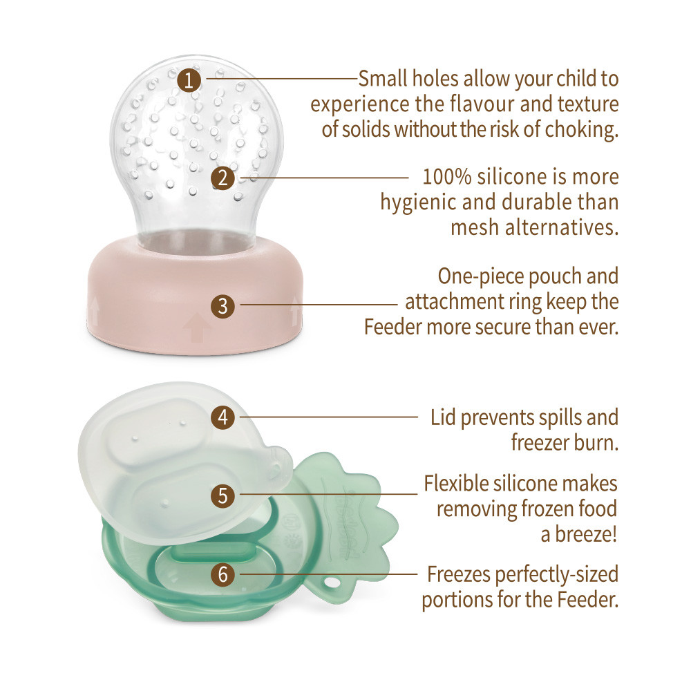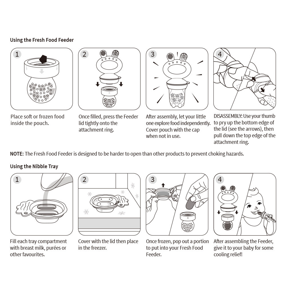 Zamrzni i Nahrani Mini Komplet je savršen način za sigurno uvođenje novih okusa vašem djetetu, pružajući istovremeno osvježenje za nicanje zubića! Ovaj komplet kombinira uvijek popularnu posudu za svježu hranu s mini verzijom naše Posude za grickanje s motivom ananasa. Komplet zamrzava hranu u savršeno prilagođene porcije, omogućavajući vašem djetetu da istražuje nove okuse i teksture bez rizika od gušenja.