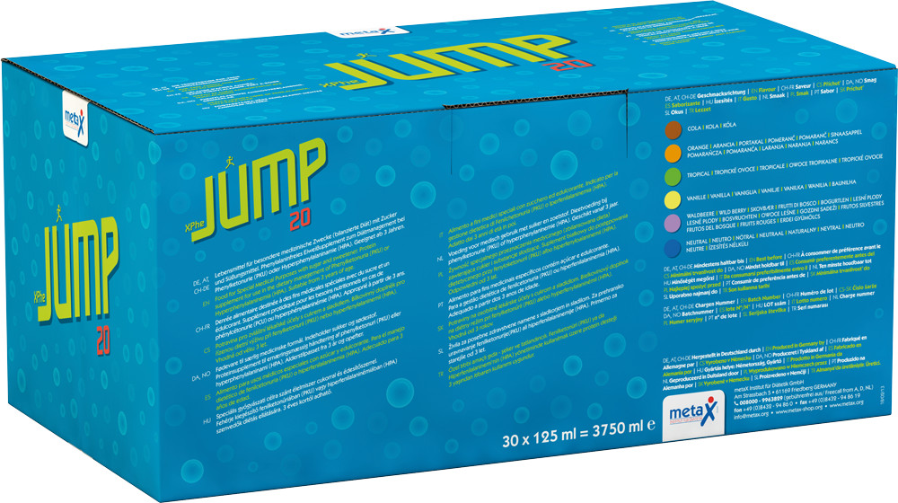 XPhe Jump je beljakovinski dodatek brez fenilalanina, tekoč in zato pripravljen za uživanje, za otroke, stare 3 leta in več – obogaten z vitamini, minerali in elementi v sledovih.