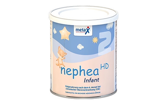 Nephea Infant je praškasta formula za peroralno in cevno hranjenje z zmanjšano vsebnostjo beljakovin in elektrolitov, namenjena dojenčkom po 6 mesecih starosti – obogatena z vitamini, minerali in elementi v sledovih.