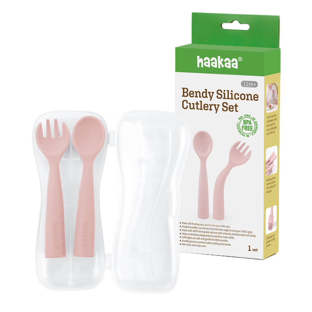 Olajšajte pot samostojnega hranjenja vašega malčka s Haakaa prilagodljivim silikonskim priborom! Pribor je prožen zaradi paličice iz nerjavečega jekla, ki je obdana s 100% silikonom za živila. Ročaji se lahko upognejo pod kotom, ki se zdi naraven vašemu malčku, ko pridobiva samozavest pri samostojnem hranjenju.