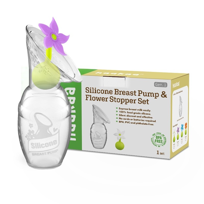 Priročna kombinacija 100% silikonske prsne črpalke Haakaa 1. generacije in zamašek rožica! Silikonska prsna črpalka Haakaa je popoln element za vse doječe mame.