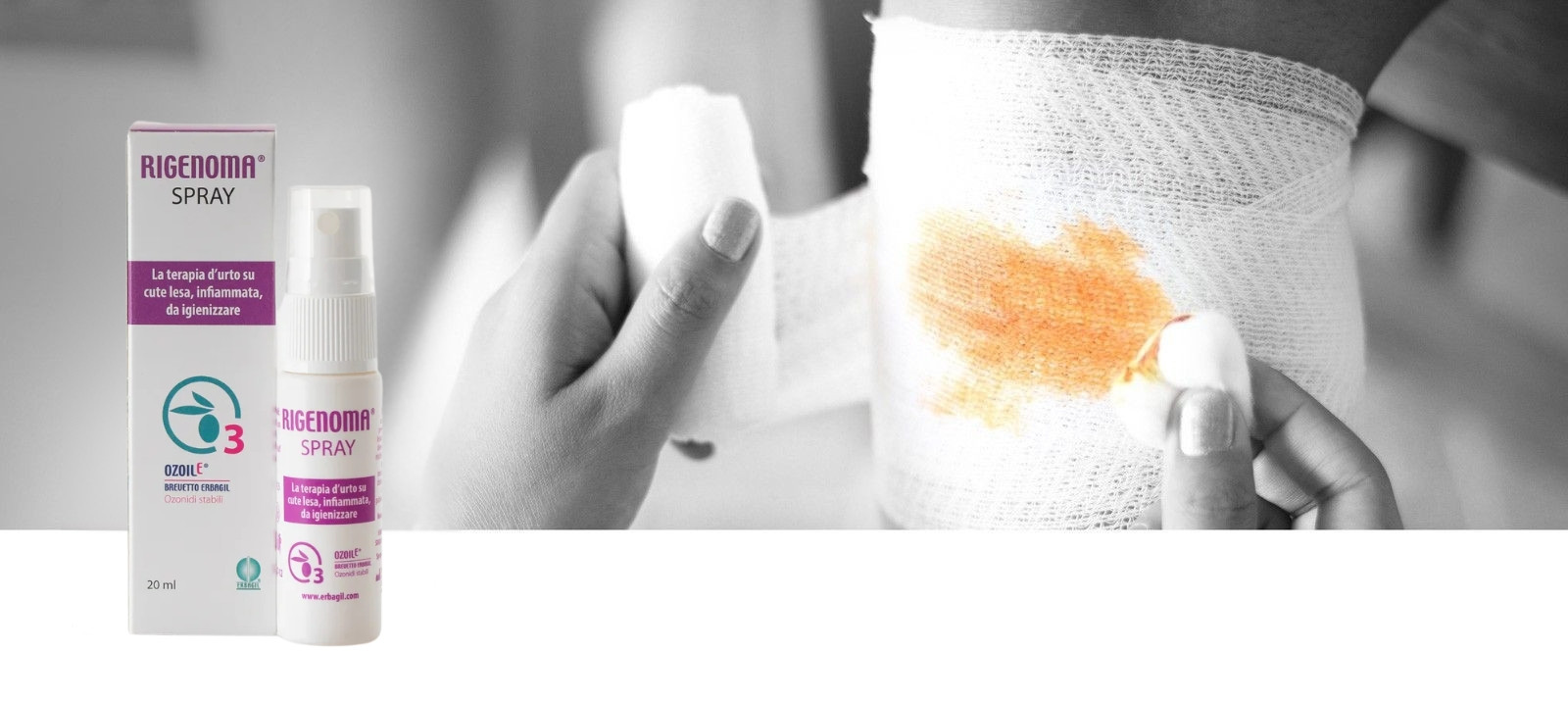 Na zalogiRIGENOMA® PRŠILO z Ozoile® Za oskrbo poškodb, vnetij in nečistoč na koži.